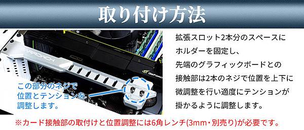 鋁顯卡支架是固定在機殼擴充槽兩個鎖檔片的鏍絲孔上,鎖上時與顯卡平行,再由顯卡支架調整孔細調準確高低位置。