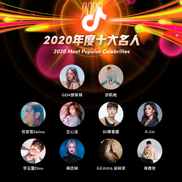 GEM鄧紫棋、許凱皓、任家萱Selina佔據名人榜上人氣寶座,而防疫「#洗手舞」、爆紅迷因「#一剪梅」、特效「#變身漫畫」與魔性舞蹈「#走到哪跳到哪」等更在台灣颳起風潮,成為 2020 最夯趨勢。TikTok 人氣票選的最受歡迎創作者,則由人氣創作者 串串李川、Han、云 拿下前三高票。在新冠肺炎疫情的影響下,TikTok 成為居家防疫必備 App,全球用戶透過 TikTok 傳播正能量,讓 #居家扭扭舞、#pewpewpew 等挑戰掀起熱潮,使人們在居家隔離期間也能互相連結、激發無限創意。