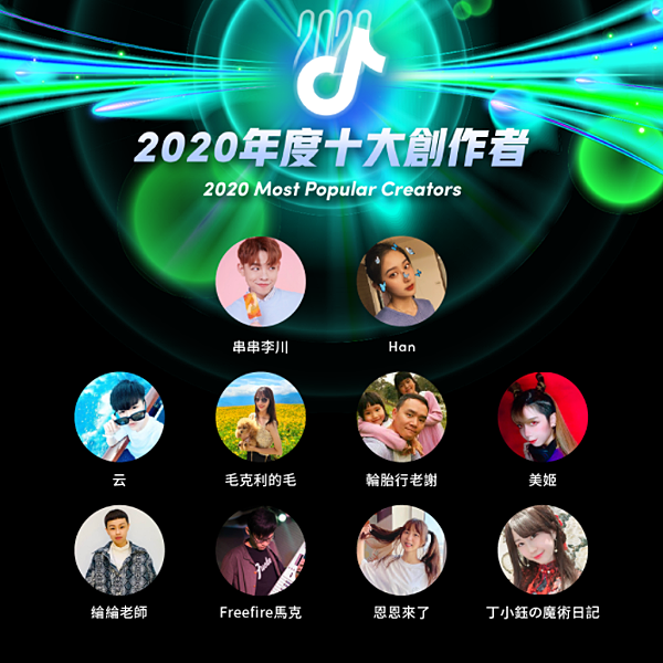 TikTok 也邀請用戶票選出心目中的最佳創作者,由人氣創作者 串串李川、Han、云 、毛克利的毛、輪胎行老謝、美姬、綸綸老師、FreeFire馬克葛格、恩恩來了,與丁小鈺の魔術日記拿下殊榮。更重要的是,截至 2020 年底,TikTok 已有 4 位破百萬追蹤的本地創作者,包括人氣網紅黃氏兄弟、以「走到哪跳到哪」爆紅的廖妹仔、拍攝手法絢麗的云,以及仿妝達人美姬。TikTok 創作者們發揮無限創意,利用多元平台與全球用戶互動交流。