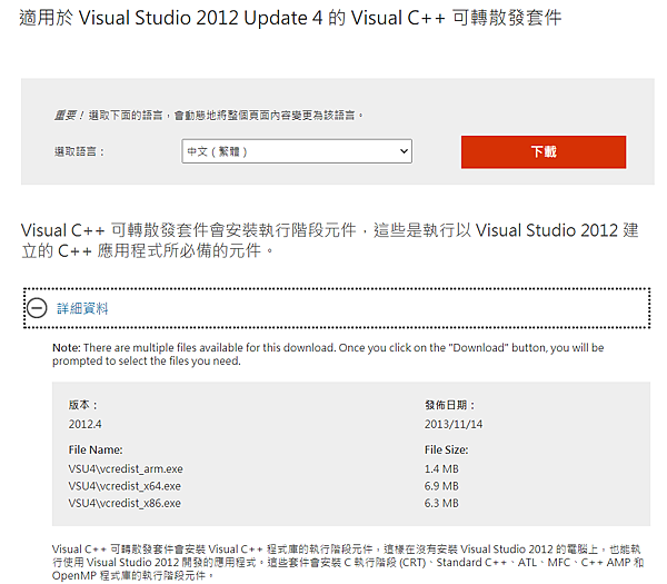 適用於Visual Studio 2012 Update 4的Visual C++ 可轉散發套件【點我微軟官網下載】