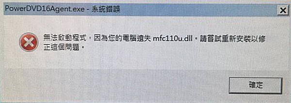 很多人安裝威力導演,無法開啟並跳出系統錯誤視窗「無法啟動錯誤,因為您的電腦遺失mfc110u.dll,請嘗試重新安裝以修正這個問題。」。