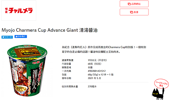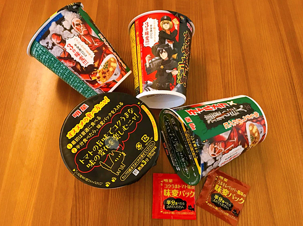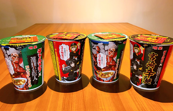 日本泡麵「明星」和剛完結的《進擊的巨人》展開合作,推出醬油杯麵及宮崎辛杯麵兩款聯名包裝,其中醬油杯麵「コンソメしょうゆ」是這次合作的全新口味,是款帶有馬鈴薯和肉末的醬油味拉麵。