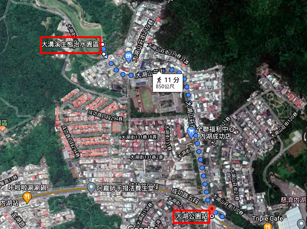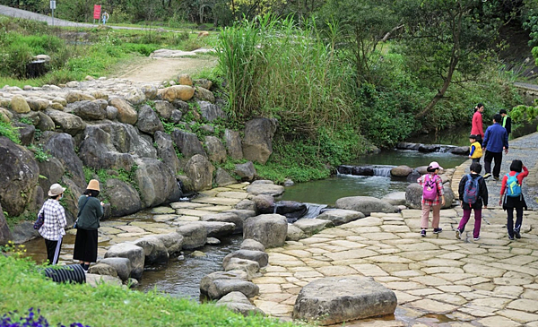 大溝溪大湖山莊社區上游,整治以砌石護岸,空間有利生物棲息,兼具親水休閒遊憩,作親水步道是台北市民的後花園。