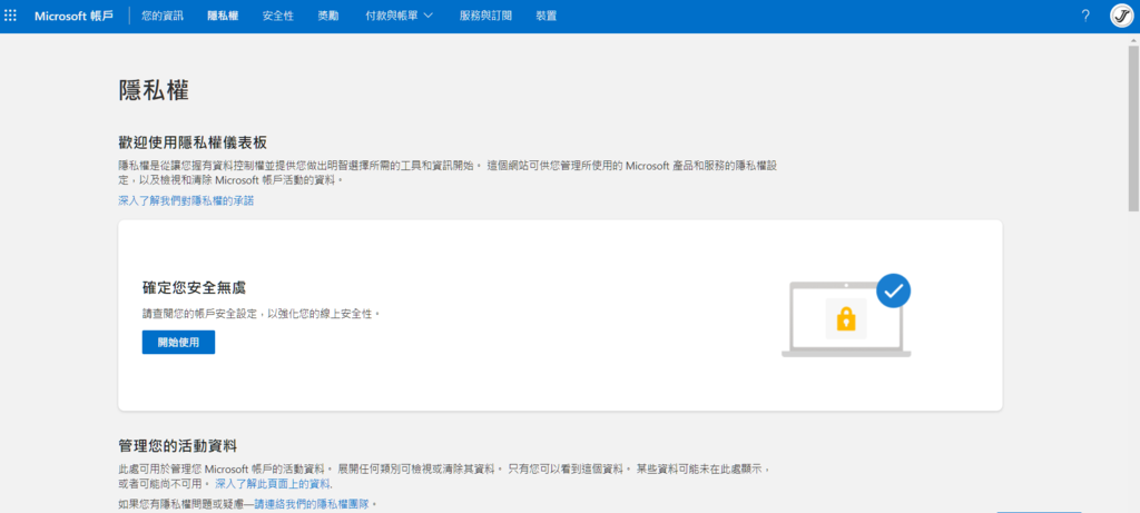 4 - 然後在"歷程記錄"下面幾行字找到“隱私資源”點擊它,隱私資源部分會連結上在官網您的帳戶中的"隱私儀權表板"。您現在會在預設瀏覽器中看到一個新選項卡打開,其中包含對隱私權儀表板的介紹。