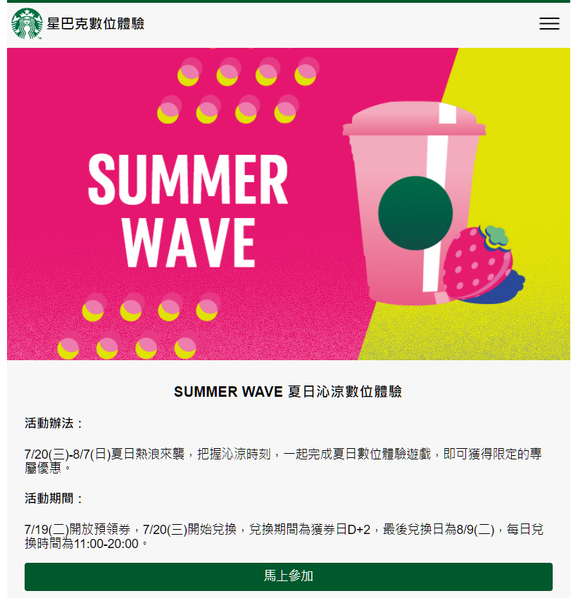 星巴克「SUMMER WAVE 夏日沁涼數位體驗」活動進入星巴克官網完成遊戲即可獲得優惠。活動官網【點我前往】