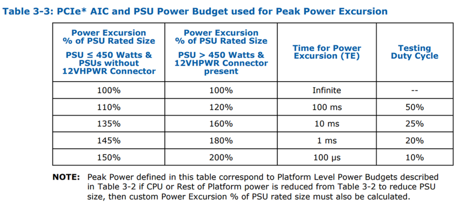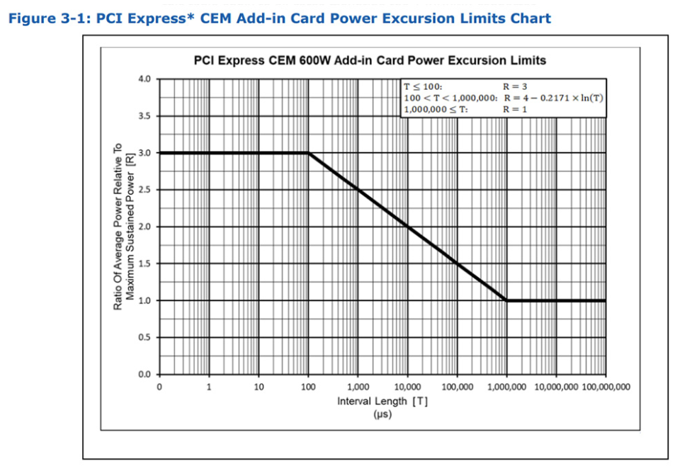 關於ATX 3.0電源的電氣性能要求,這裡以12VHPWR供電接口來舉例說明,12VHPWR供電接口可以提供高達600W供電能力,但是這個600W供電能力指的是持續輸出能力,峰值功率的要求顯然更高。按照ATX 3.0電源設計指南給出的規格,若其峰值功率的持續時間不超過100微秒,那麼其峰值功耗允許達到TDP的3倍,也就是600W TDP顯卡,允許在100微秒內獲得1800W供電能力;如果峰值功耗持續時間是在100微秒到1秒之間,那麼硬體可以獲得的功率與時長呈反比,持續的時間越長,允許的峰值功耗越低。