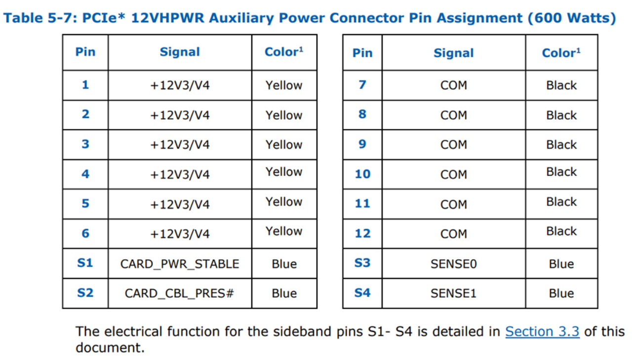 我們來看一看12VHPWR供電接口定義,該接口的12pin全部用在供電,而下方的4pin是顯卡與電源的通訊接口,從左至右分別為S1、S2、S3、S4,其中S1與S2主要用於顯卡與電源之間的工作狀態信息傳遞,而S3與S4是通過高低電平組合來表示接口功率。