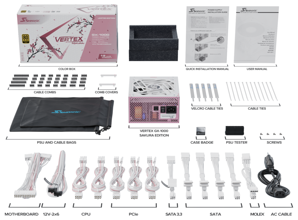 海韻VERTEX GX-1000金牌櫻花版,因櫻花版彩盒內的線材包為金牌750W版本,與原本金牌1000W版本線材有缺少,