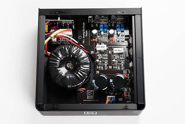 觀察Super 3的內部配置,乍看之下很像傳統線性電供。但其實內部中小顆的電容是超大容量的超級電容,這個超級電容群讓Super 3的總電容值來到3.3法拉(F)。而一般音響器材內部電源線路的電容值是微法拉(uF),而法拉是微法拉的百萬倍。在比許多後級擴大機的電源線路電容數值大上數百倍,Super 3供電條件已無異於電池供電。當然周邊環節同樣考究,變壓器使用訂製的三重屏蔽軍規環形變壓器。還用上低ESR電容以及高頻扼流圈作為電源濾波。官方表示Super 3內部共有6組 π 型濾波器,可完全解決高頻雜訊的問題。