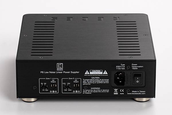 KECES 的線性電源所用的變壓器,都是自己繞製的,P6 也不例外。兩組輸出都有獨立的地,其中的穩壓線路為全離散式的,不使用 IC 穩壓;這點則與旗艦線性電源 P28 一樣。超低 ripple noise,且不產生任何哼聲或嘶聲。P6 還設有保護線路,機器溫度過高時會自動切斷。機箱當然也延續自家標準,以全鋁合金組建而成,機箱扎實,底部配上大型腳墊,上蓋還有挖孔以利散熱。